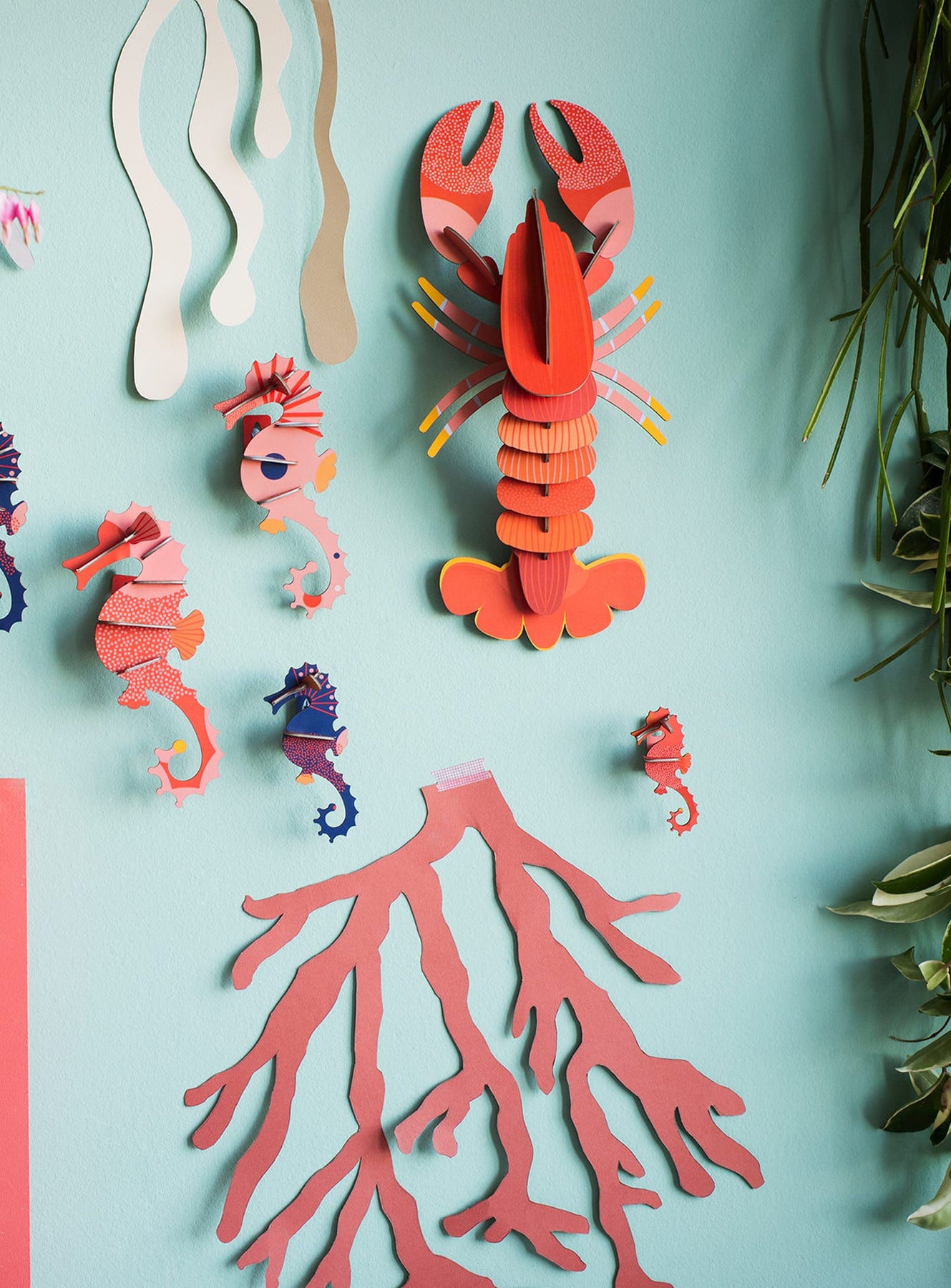 Dive beneath the waves with the Lobster by Studio ROOF, a bold and intricate 3D wall art piece that celebrates the wonders of the sea. Inspired by the delicate beauty of marine creatures, this eco-friendly design transforms recycled cardboard into a vibrant underwater treasure.