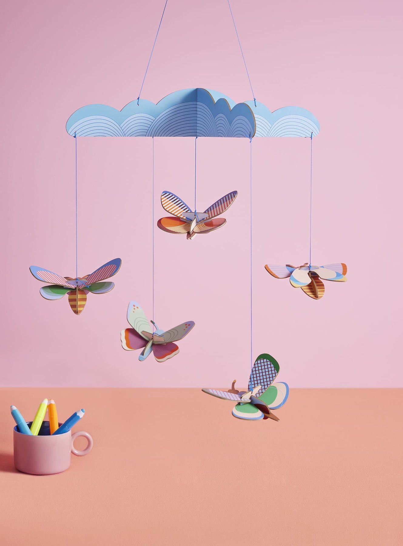 The Butterfly Dance Mobile by Studio ROOF brings a whimsical touch to nurseries and children’s rooms. Inspired by the graceful flutter of butterflies, this 3D hanging decoration adds beauty, serenity, and a spark of creativity to any child’s environment.