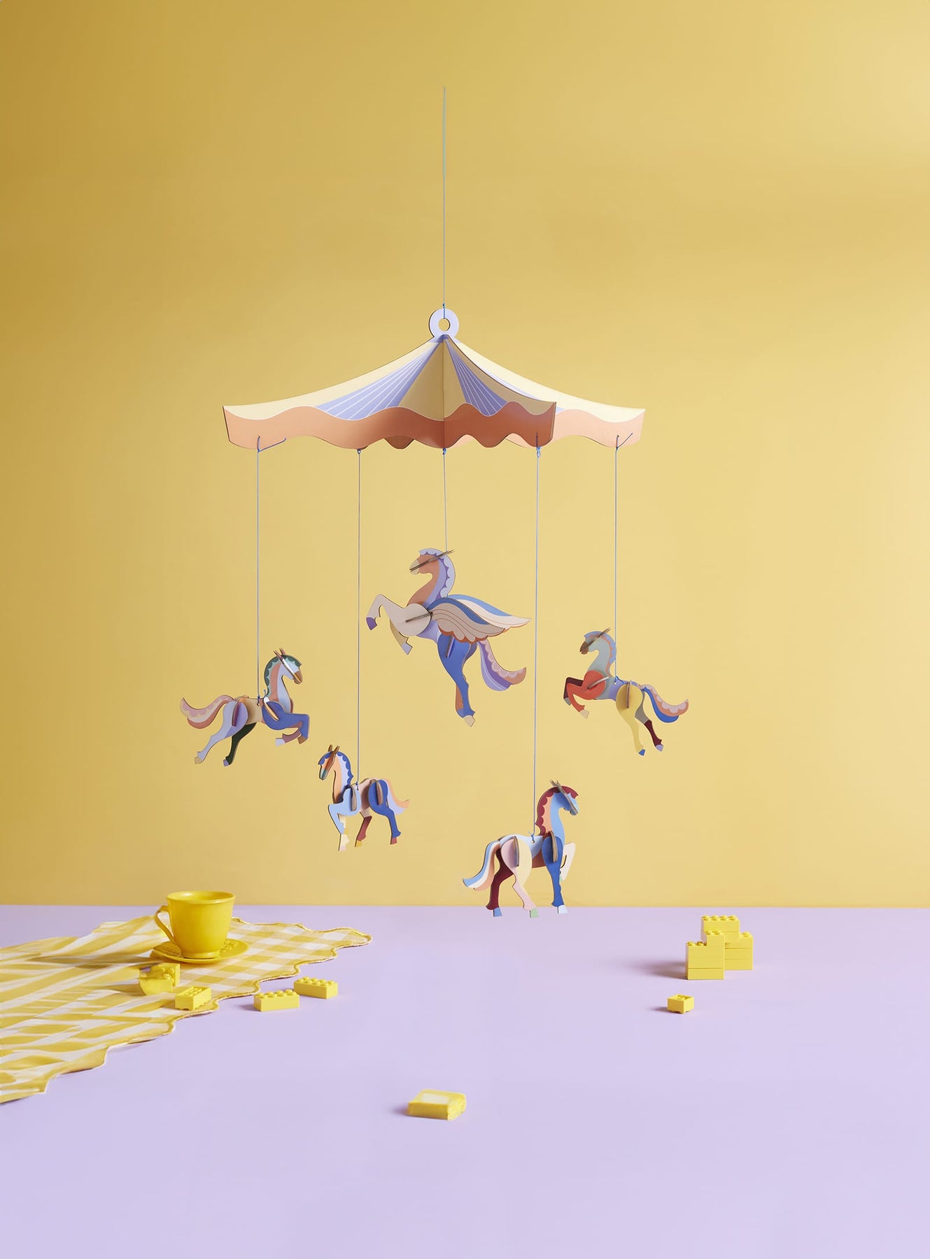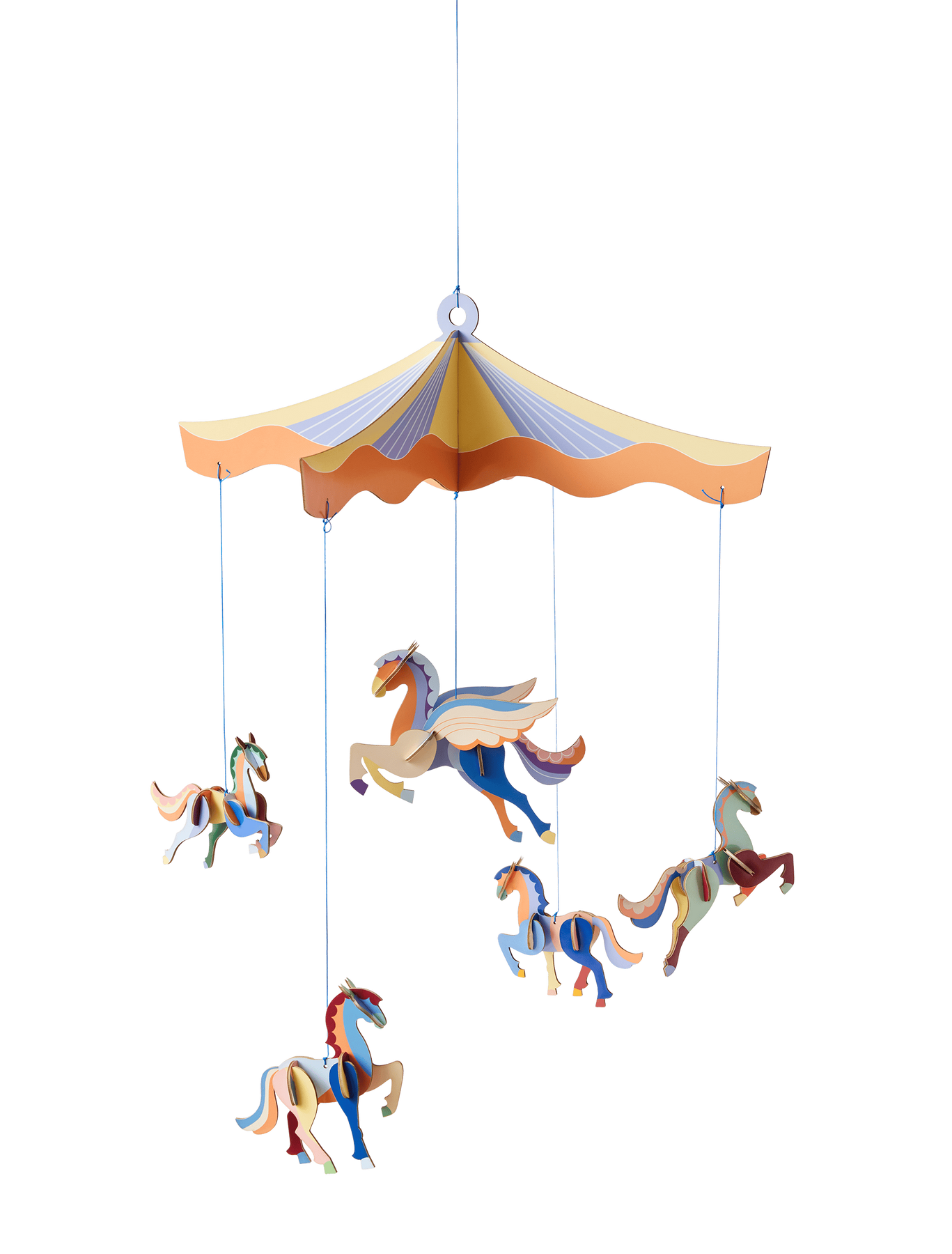 The Circus of the Sun by Studio ROOF is a playful and poetic baby mobile that turns every nap into a dream under the big top. Featuring four elegant horses and one charming pegasus, it brings a joyful, storybook energy to your nursery decor.